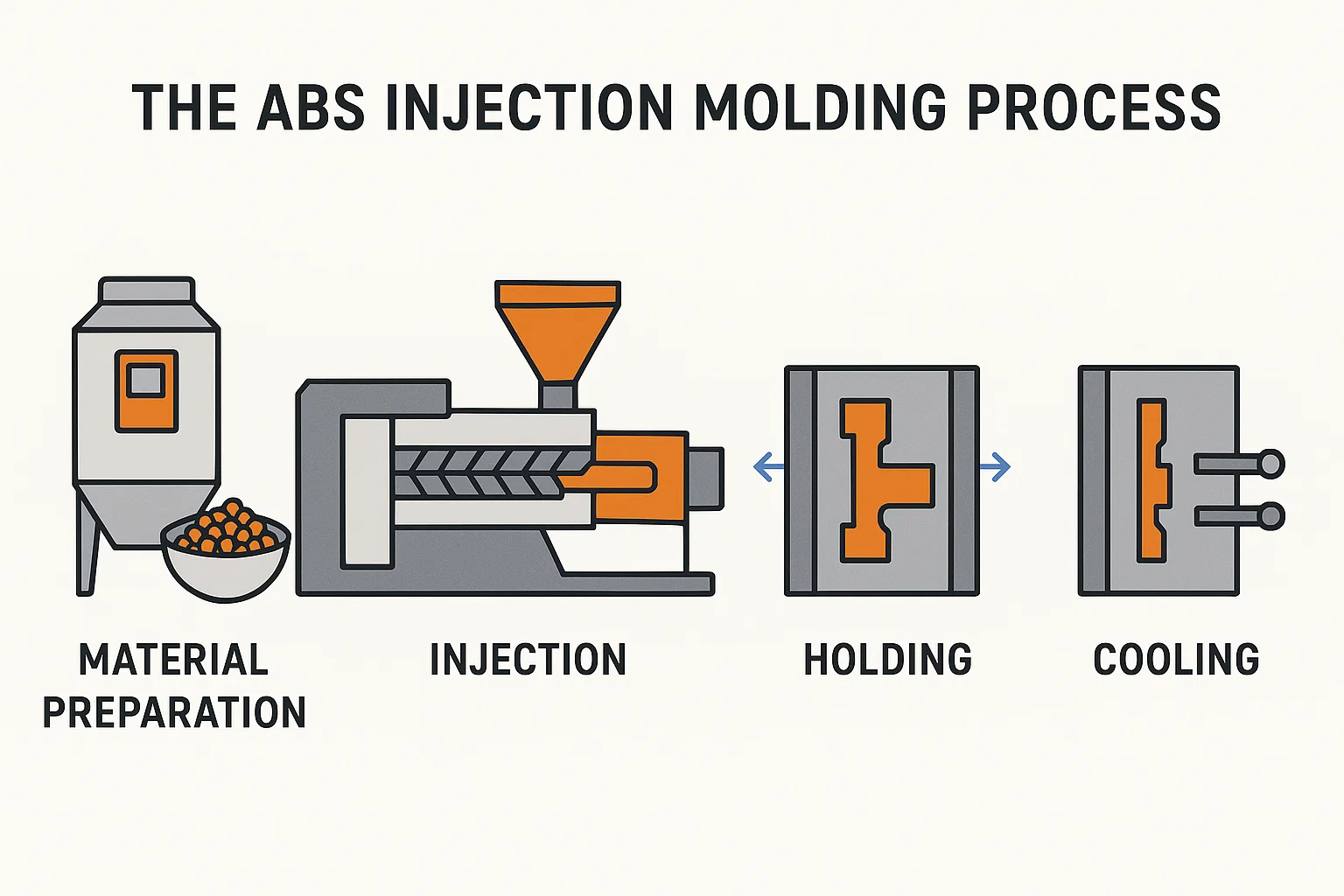 ABSの射出成形プロセスは、基本的に他の熱可塑性物質の成形に似ていますが、ABSのユニークな特性を活用して高品質の部品を確保するために、特定のパラメーターに注意を払う必要があります。このプロセスは周期的であり、完全なサイクルごとに新しい部品を生成します。