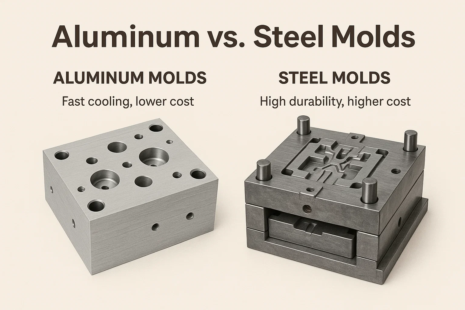 スチール型 耐久性の議論の余地のないチャンピオンです。数百万サイクルに耐えるために構築された彼らは、摩耗、摩耗、腐食に抵抗し、大量の製造に最適です。 アルミニウム型 、強いが、柔らかいです。彼らはより速く摩耗し、より短い生産走行に最適です。通常は、寿命を延ばすために特別なコーティングで扱われない限り、通常は100,000部品です。