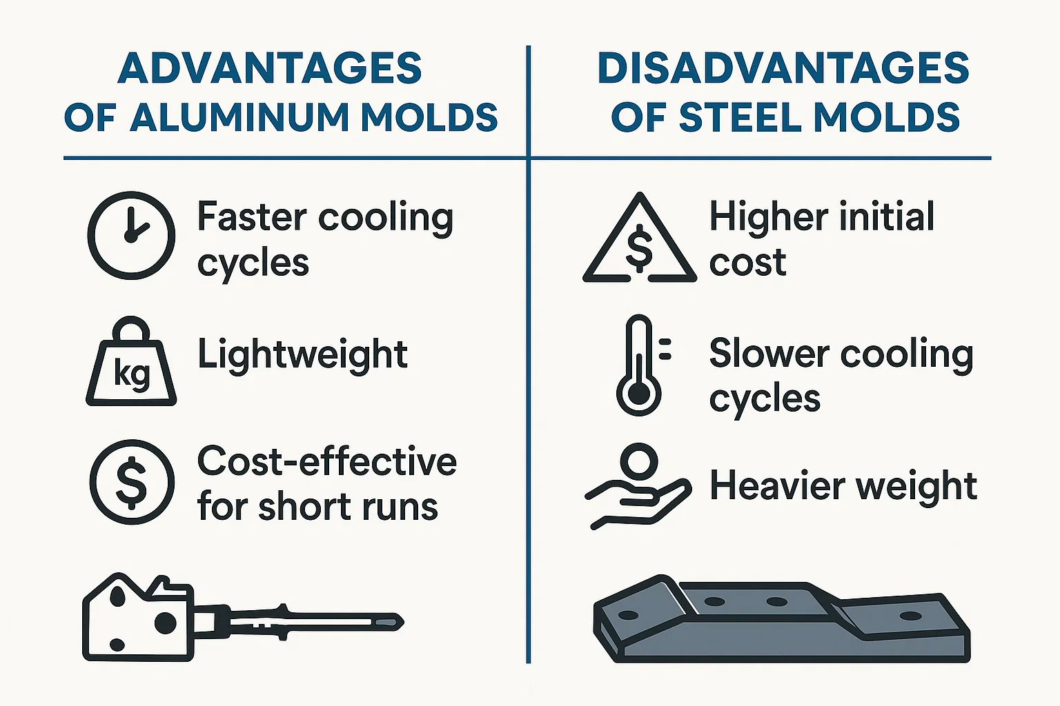 これがここです アルミニウム型 本当に輝いています。アルミニウムは、鋼の5倍速い熱を透過します。この高い熱伝導率は、金型が大幅に速く低下することを意味し、サイクル時間を劇的に短縮し、生産速度を向上させます。 スチール型 対照的に、熱をより長く保持し、冷却が遅くなり、全体的なサイクル時間が長くなります。