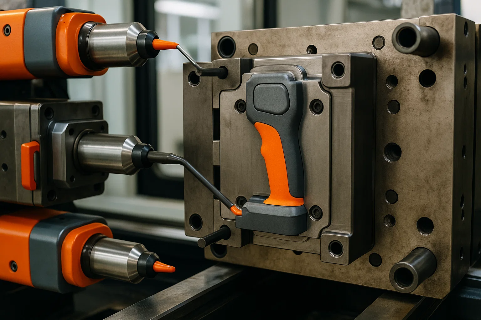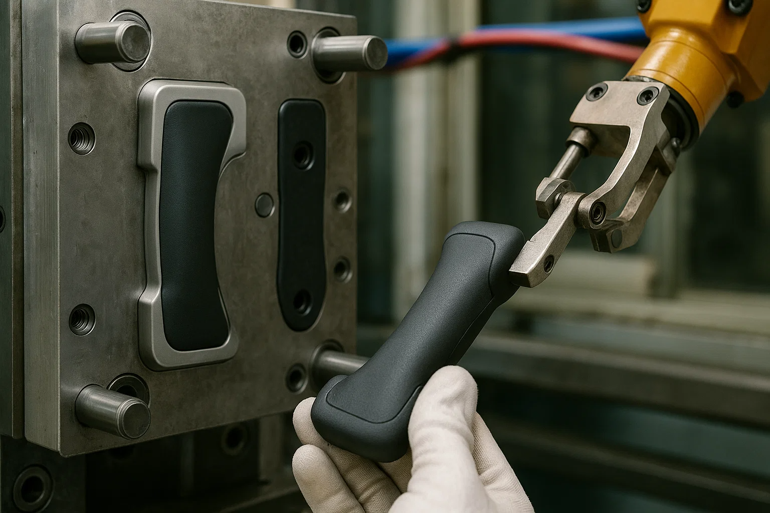 解決: メーカーが実装しました オーバーモールディング 2ショットの射出成形プロセスを使用します。まず、構造ハンドルボディは、耐久性のある硬いABSプラスチックから成形されました。この剛性の「基質」は、同じ成形機内で2番目のキャビティに回転しました。ここでは、ABSハンドルの特定の領域に柔らかいエラストマー熱可塑性加剤(TPV)が注入され、快適な非滑りのグリップが形成されました。