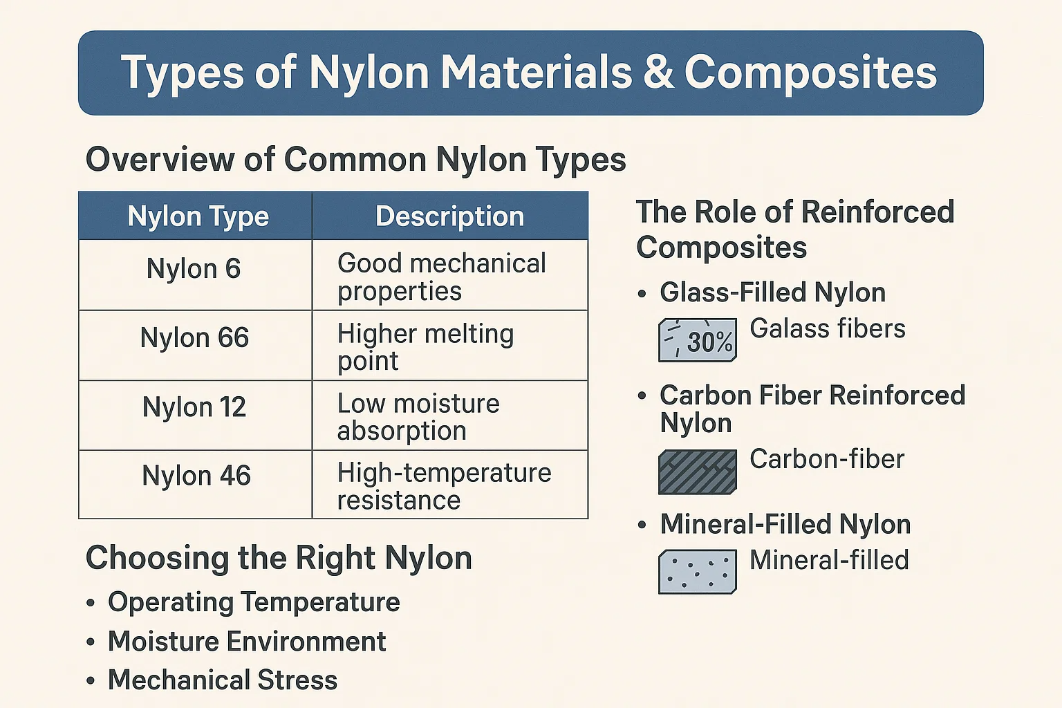 ガラス入りナイロン: 最も一般的な複合には、次のものが含まれます。 ガラス繊維 (例: ナイロン 6 GF30、30% のガラス繊維を含むナイロン 6 を意味します)。これにより、材料の量が大幅に増加します 引張強さ、剛性(弾性率)、熱たわみ温度 。ただし、材料の収縮も増加し、結果として収縮率が高くなる可能性があります。 反り そして requires careful mold design.