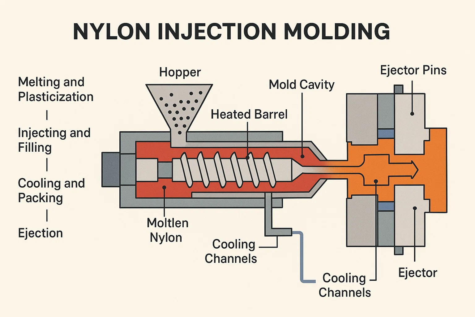 ナイロン原料 (通常はペレットの形) がホッパーから加熱されたバレルに供給されます。あ 往復ネジ バレルの内側で材料を剪断し、圧縮します。バレルヒーターからの熱とスクリューの動きからの摩擦熱の組み合わせによりナイロンが溶け、バレルの前方に移動します。を防ぐために、このステップは慎重に制御する必要があります。 熱劣化 ナイロンの劣化により、最終部品の機械的特性が損なわれる可能性があります。