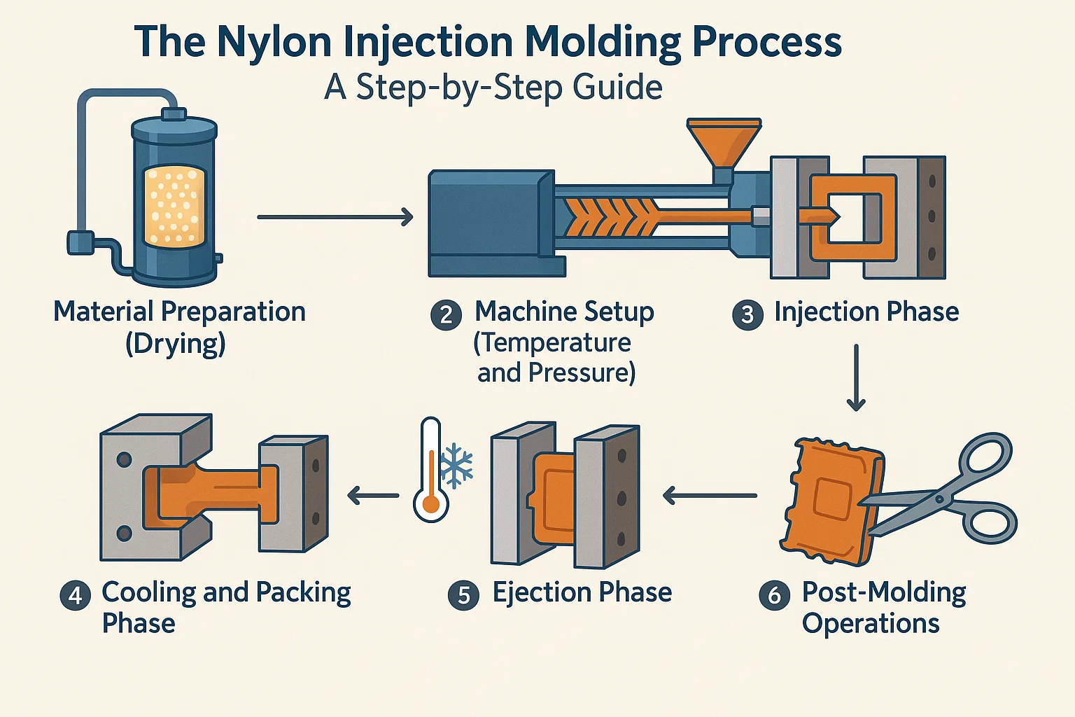 このプロセスは基本的に他のプラスチックの射出成形と似ていますが、ナイロンの独特な材料特性 (特に融点が高く、吸湿性が高い) により、温度、湿度管理、射出圧力に特別な注意が必要です。