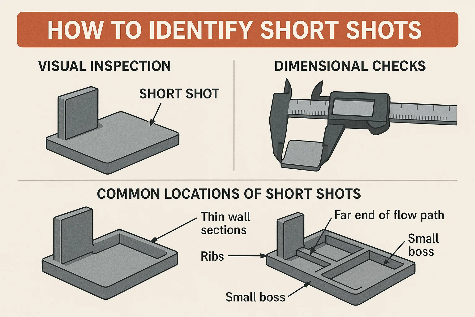 ショートショットを特定することは、非常に目に見える欠陥であるため、通常は簡単です。ただし、体系的なアプローチは、問題を確認し、正確な場所を特定するのに役立ちます。これは、効果的なトラブルシューティングに不可欠です。