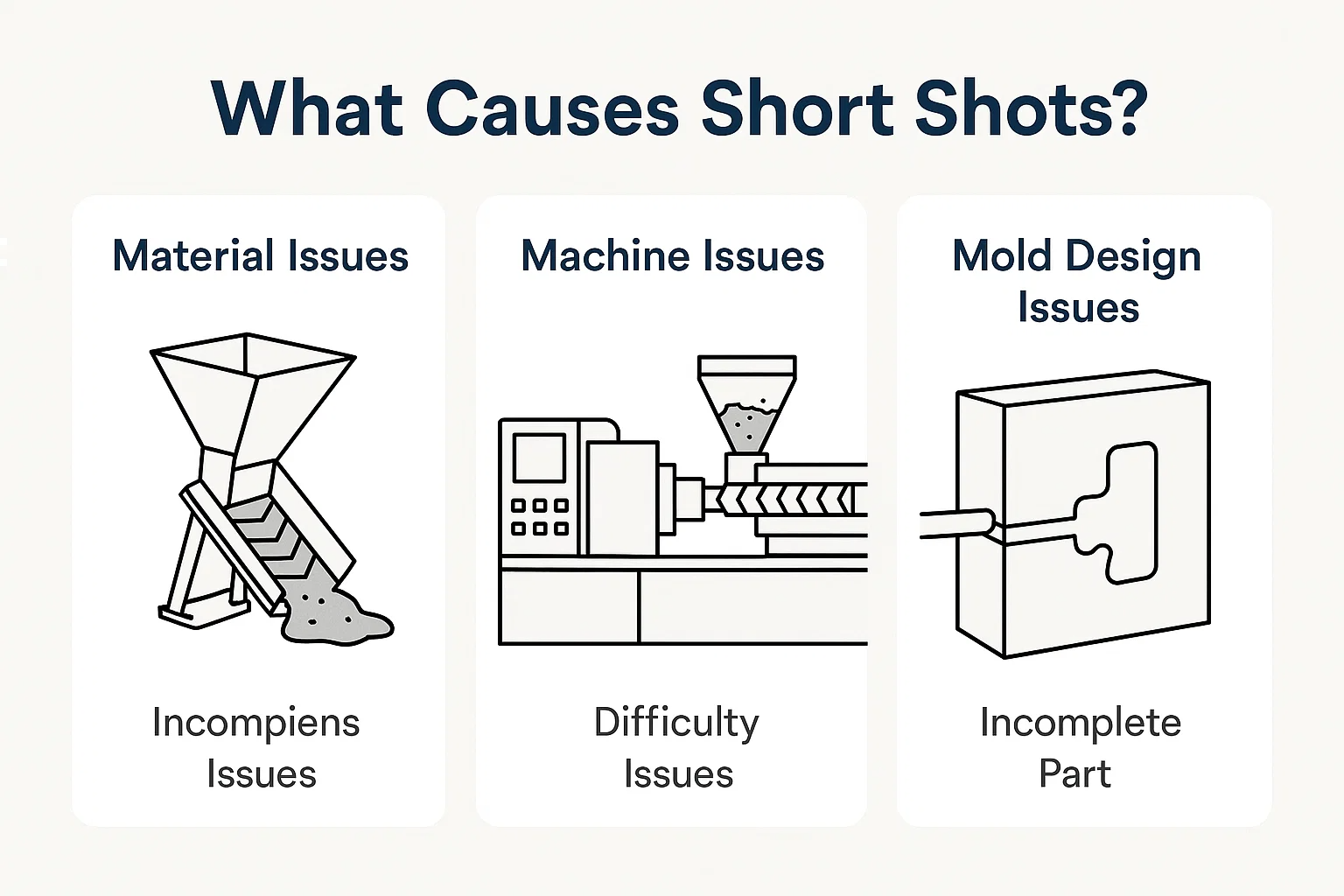 原因は射出成形プロセスのいくつかの異なる領域に由来する可能性があるため、ショートショットの診断には体系的なアプローチが必要です。最も一般的な問題は、素材、マシン設定、または金型の設計自体にまでさかのぼることができます。